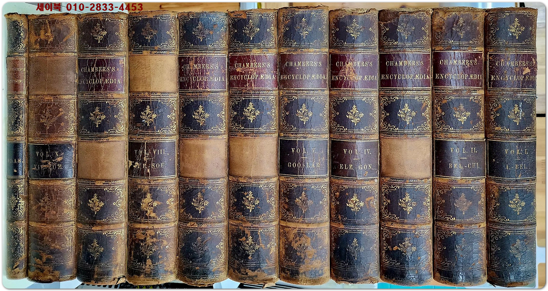 “1868년 출판된 Chambers’s Encyclopaedia 초판 미국판 가죽 장정본. 19세기 영국 지성사를 대표하는 고전 백과사전으로, 인테리어 및 수집용으로 적합.”